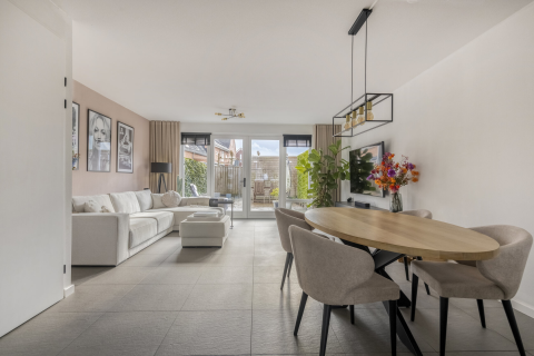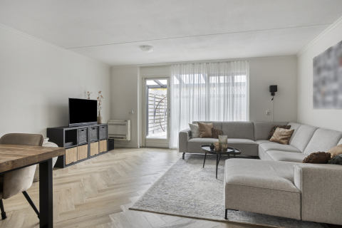 Aan het einde van de hal ligt de sfeervolle woonkamer met open keuken van in totaal ruim 35 m². De keuken staat in een praktische U-opstelling en is voorzien van een koelkast, inductiekookplaat, oven, dubbele spoelbak, afzuigkap en vaatwasser. De woonkamer heeft een laminaatvloer, spachtelputz wanden en een strak plafond, wat zorgt voor een verzorgde, moderne uitstraling.